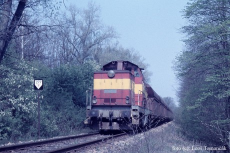 Pohled na jedinou lokomotivu řady 735 s lignitem z Dubňan nebyl obvyklý a za 17 měsíců takového provozu si na něj málokdo zvykal. Stroj 735.271 veze dopoledne 28. dubna 1993 vlak Pn 64885 z Dubňan do Hodonína lesem Hodonínské Dúbravy. Foto: Leoš Tomančák