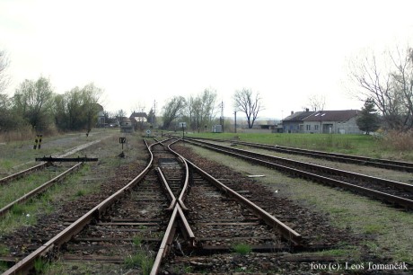 Na podzim 2004 byla snesena podstatná část bývalé stanice Dubňany a zůstala krátce zachovaná jen část jižního zhlaví, aby bylo teoreticky možné vjet na zatím nezrušenou vlečku sklárny Horní Huť. Duben 2006. Foto: Leoš Tomančák