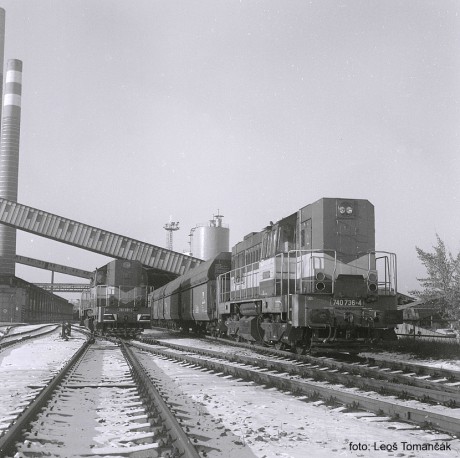 Zatímco lokomotiva 740.736 sunula vozy do čelního výklopníku, vedle zastavila 740.681. Vlevo od ní je hlubinný výklopník a současně rozmrazovna. Psal se pozdní podzim roku 1996.