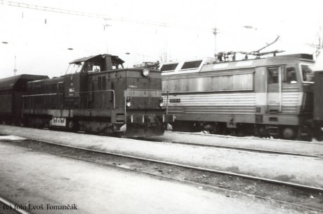Cesty uhelných vlaků začínaly a končily v Hodoníně. V poledne 29. 12. 1990 se tam setkal stroj T 466.0010 v čele vyrovnávkového vlaku do Rohatce s lokomotivou 363.015 na pražském rychlíku R 809. Foto Leoš Tomančák