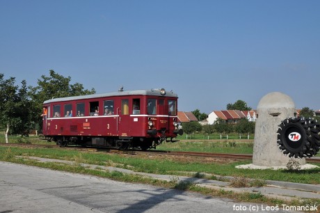 Motoráček M 131.1454 jede od bývalého Dolu Tomáš, při vinných sklepech na Slavíně, k zastávce U lípy, kde se vedle důlního kombajnu objevil i betonový cylindr, náležící k pohraničnímu opevnění. Foto Leoš Tomančák
