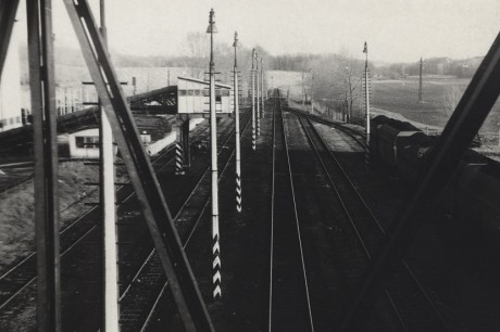 odobně pojatý snímek, avšak pořízený o dvě dekády později. Na koleji č. 3 je naložená souprava, kde už převládají modernější vozy řady Falls (Wap), zatímco starší samovýsypné vozy řady Fall (Wa) jsou již na ústupu.