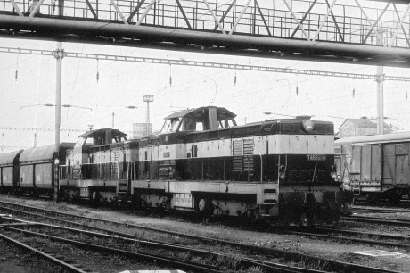 Přípřež turnusových strojů T 466.0271 + T 466.0064 dopravila dopoledne 12. května 1992 prázdnou soupravu z elektrárny do stanice Hodonín. Na odhlášku za osobním vlakem MOs 4408, vyrazí jako Vn 54464 do Mutěnic a Dubňan. Foto Leoš Tomančák
