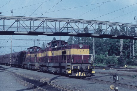 Dvojice lokomotiv T 466.0064 + T 466.0009 odjíždí ráno 8. 6. 1992 z Hodonína. Dlouhá souprava vlaku Vn 54462 už nabrala patřičnou rychlost a vzápětí se zavlní na severním zhlaví. Foto Leoš Tomančák