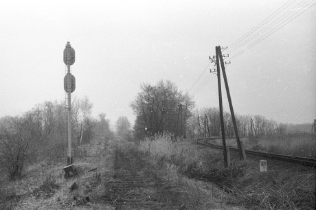 Pohled na těleso právě snesené vlečky z Dubňan na ÚZ Šardice v únoru 1994, přes vjezdové návěstidlo. V pozadí je patrná jeho předvěst. Zcela vpravo snímku je vjezdové návěstidlo od Kyjova. Foto Leoš Tomančák