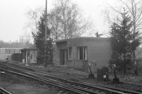 Léta nepoužívané stavědlový domek na kyjovském zhlaví stanice Dubňany. Namísto něj sloužila tzv. unimobuňka v sousedství. Stojany pomocných stavědel, kde měli dozorci výhybek možnost přebírat obsluhu od výpravčích, jsou patrné v popředí.Foto Leoš Tomančák