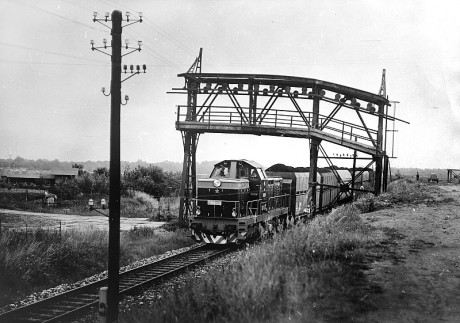 T 466.0138 v km 35,9 místní dráhy Zaječí - Hodonín nad Hodonínem, kde lomí niveleta trati. Na snímku z let 1977 - 1978 dominuje část konstrukce rušené visuté lanovky cihelny. Nahradil ji pásový dopravník. Foto sbírka Antonín Kučera